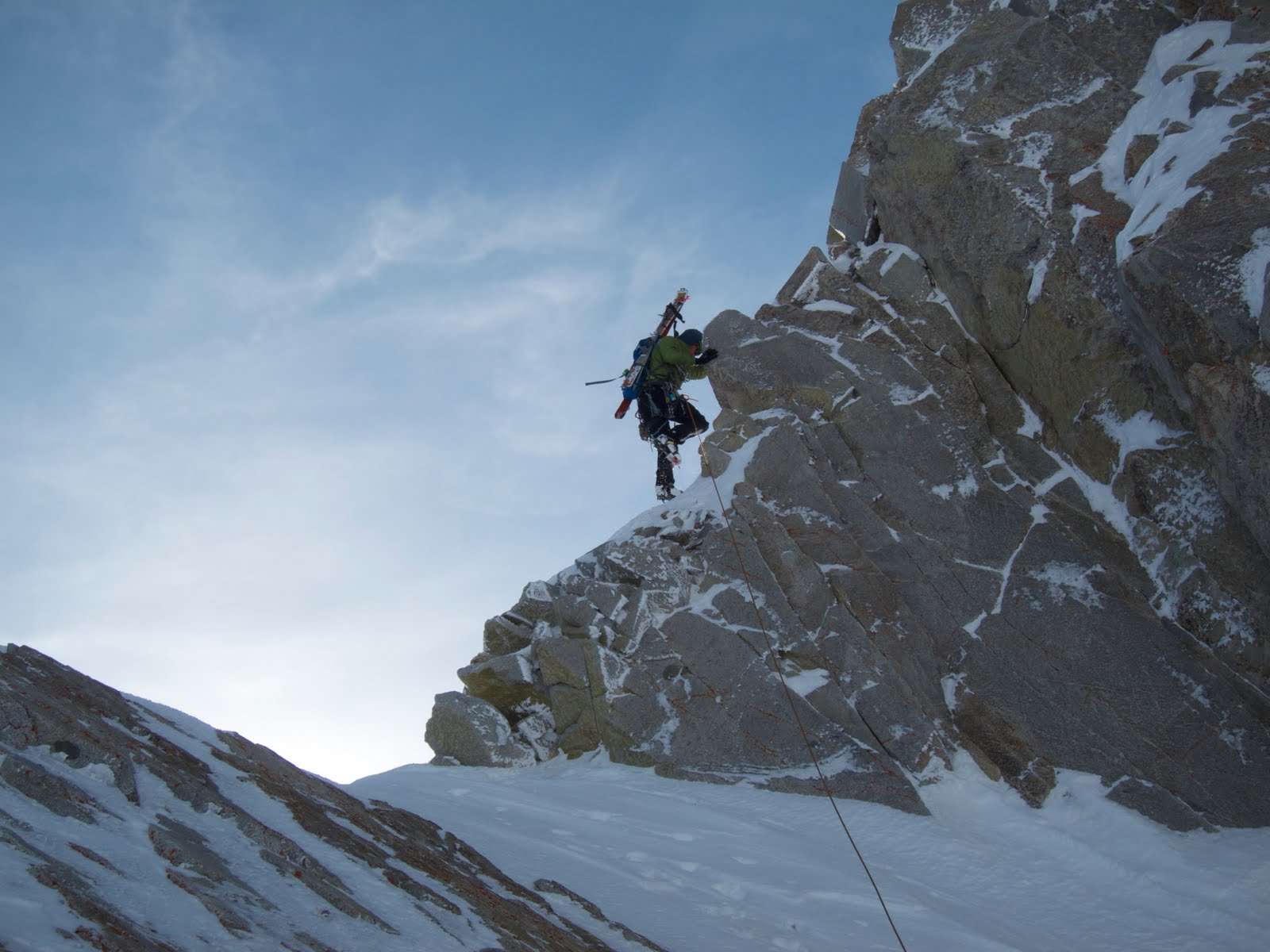 A full day off work meant we had a full day at work on the Pfeifferhorn again. The plan was to climb the 5.easy but aesthetic North Ridge and then try to ski from the summit down the ridge and out onto the NE face, easing into the NE couloir, and then rapping to freedom and the apron below.